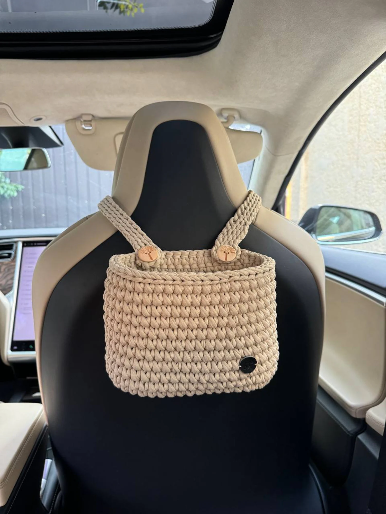 Made from 100% cotton yarn (OEKO-TEX® Standard 100 certified), with wooden buttons and a leather tag. Available in multiple colors from the palette. Strap options include crochet or leather (orange, beige, black, brown).