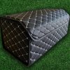 Car Trunk Organizer for efficient storage and organization. Size: 19.7 x 11.8 x 11.8 inches. Made from eco-friendly faux leather with reinforced stitching and woven tape edges for durability. The material is resistant to heat and cold, water-repellent, and dirt-resistant.